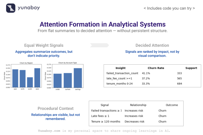 Similarly, in customer analytics, patterns like “late payments often precede churn” are structural relationships. If a tool only considers what is in view for one session, it won’t carry that relationship forward to future analyses automatically.