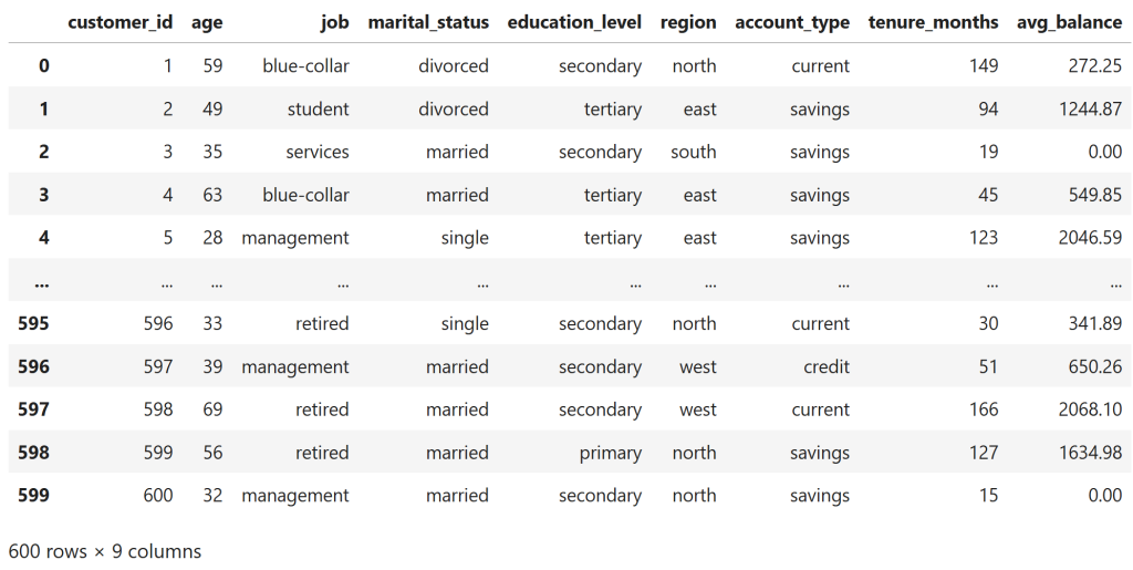 "region": np.random.choice(["north", "south", "east", "west"], size=num_customers),