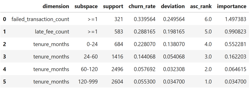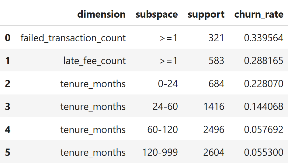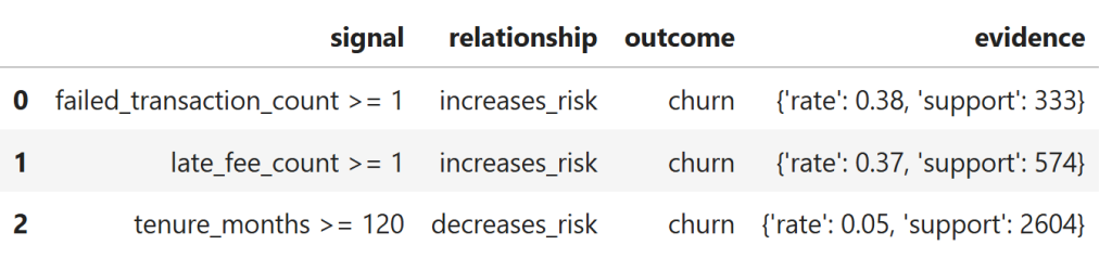 Each row captures a stable relationship between a behavioral condition and churn, along with explicit supporting evidence.