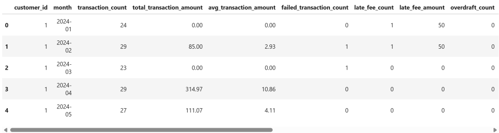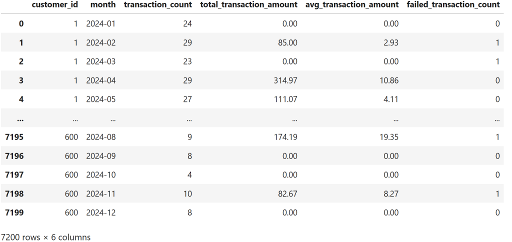 This structure preserves temporal detail — penalties and failed transactions appear in the months they occur — while keeping the customer outcome attached without collapsing the timeline.