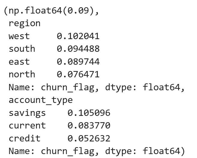 For example, churn ranges from roughly 7.6% in the lowest region to about 10.2% in the highest, and savings accounts show higher churn than credit accounts.
