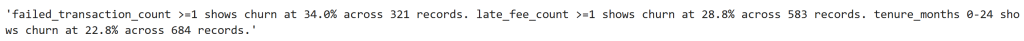 Customers with at least one failed transaction show a churn rate of ~34%, followed by those incurring late fees at ~29% — both more than three times the overall churn rate.