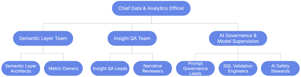 The BI function transitions into a governance-driven model, focused on metric definitions, semantic logic, lineage oversight, AI-generated insight validation, and training executives on conversational analytics. They steward quality, not dashboards; governance, not requests.