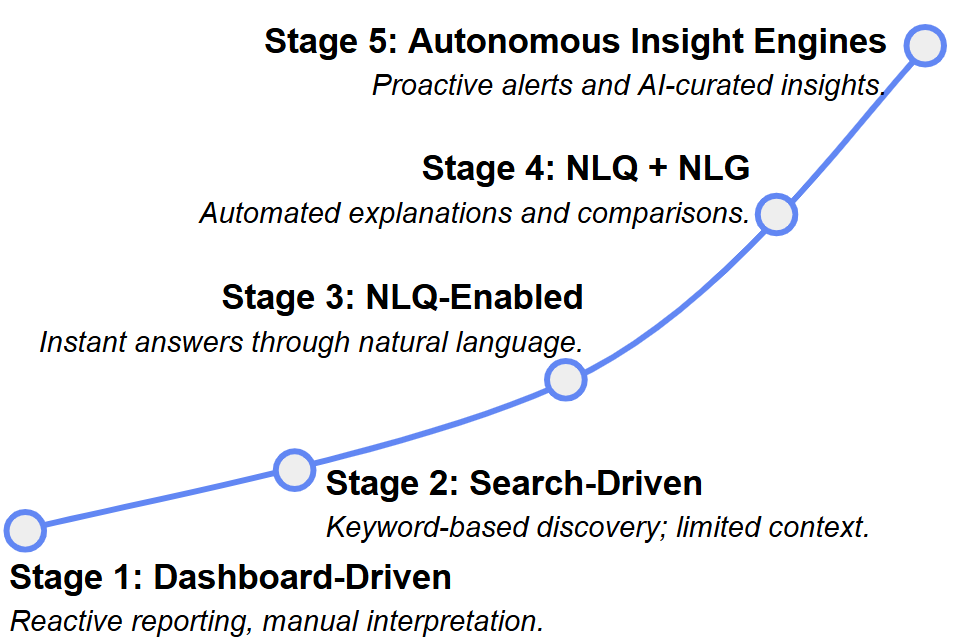 NLP-driven analytics reshape executive habits in four distinct, observable stages. Each stage reflects a shift in how leaders ask questions, interpret information, and make decisions — not because their intent changes, but because the friction around inquiry disappears.