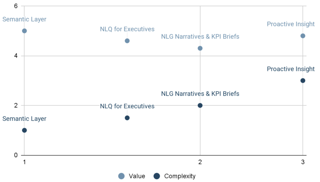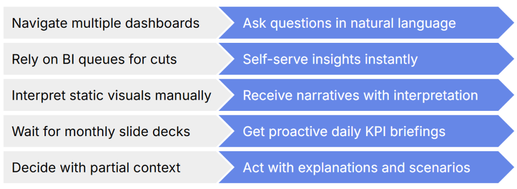 Executives move from browsing → probing. BI no longer constrains the flow of inquiry; the analytical dialogue expands naturally as leaders follow evidence and curiosity.