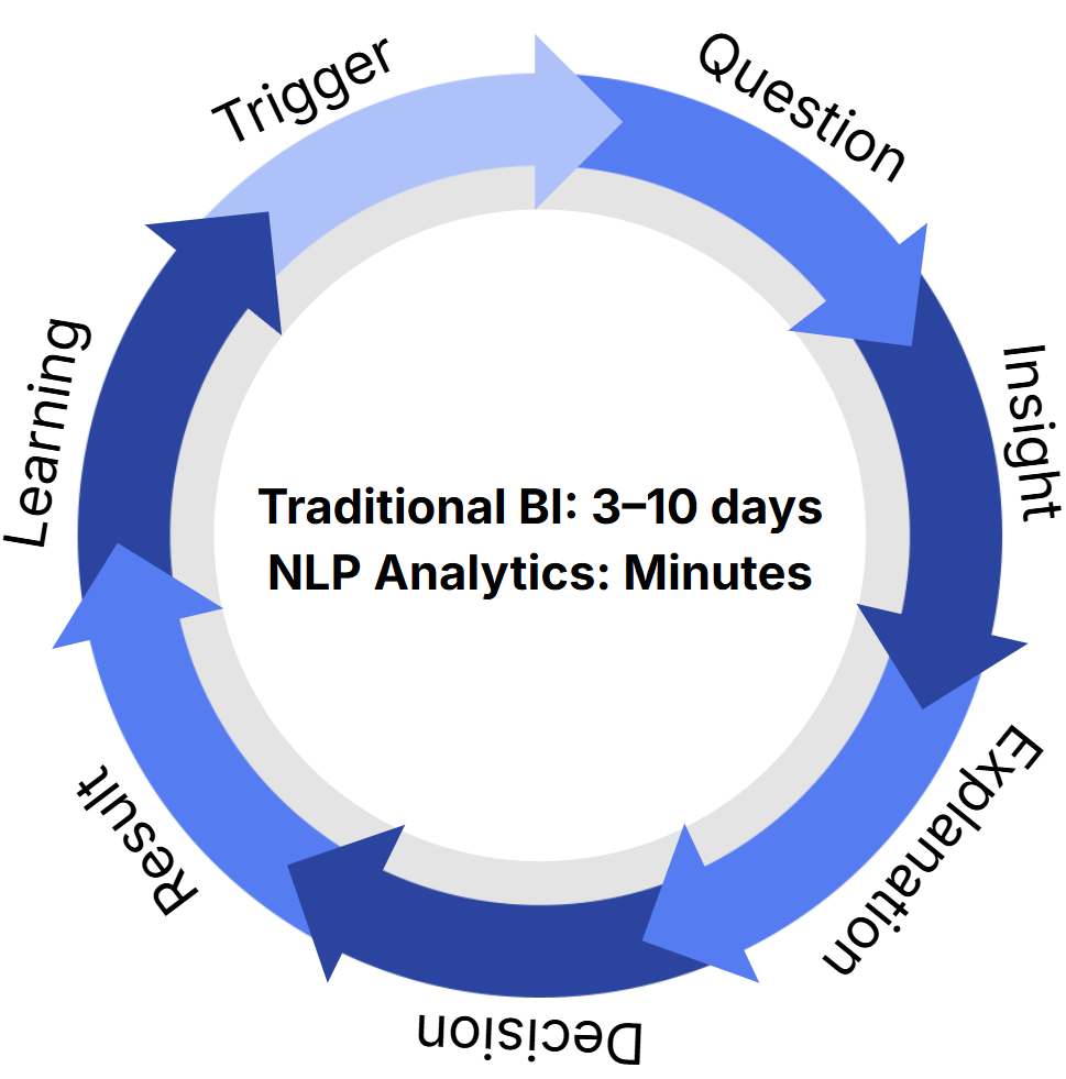 Conversational, NLP-powered analytics replaces this friction-heavy model with a far more natural one: a direct dialogue with data. Instead of searching, clicking, filtering, or waiting for new views to be built, executives ask questions in plain language and receive precise answers, explanations, and contextual narratives instantly. Inquiry cycles that previously took days compress into seconds.