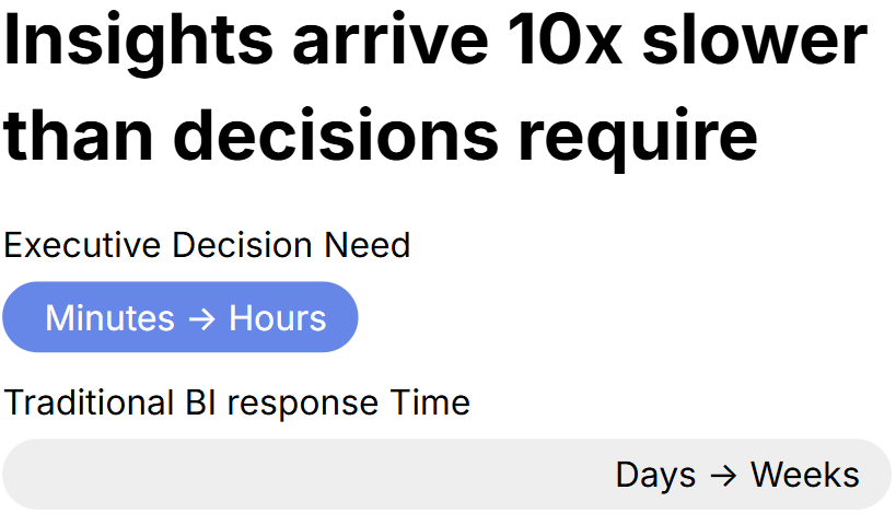 Decision cycles are shrinking across industries, often moving faster than BI teams can respond. Executives now operate in environments where: